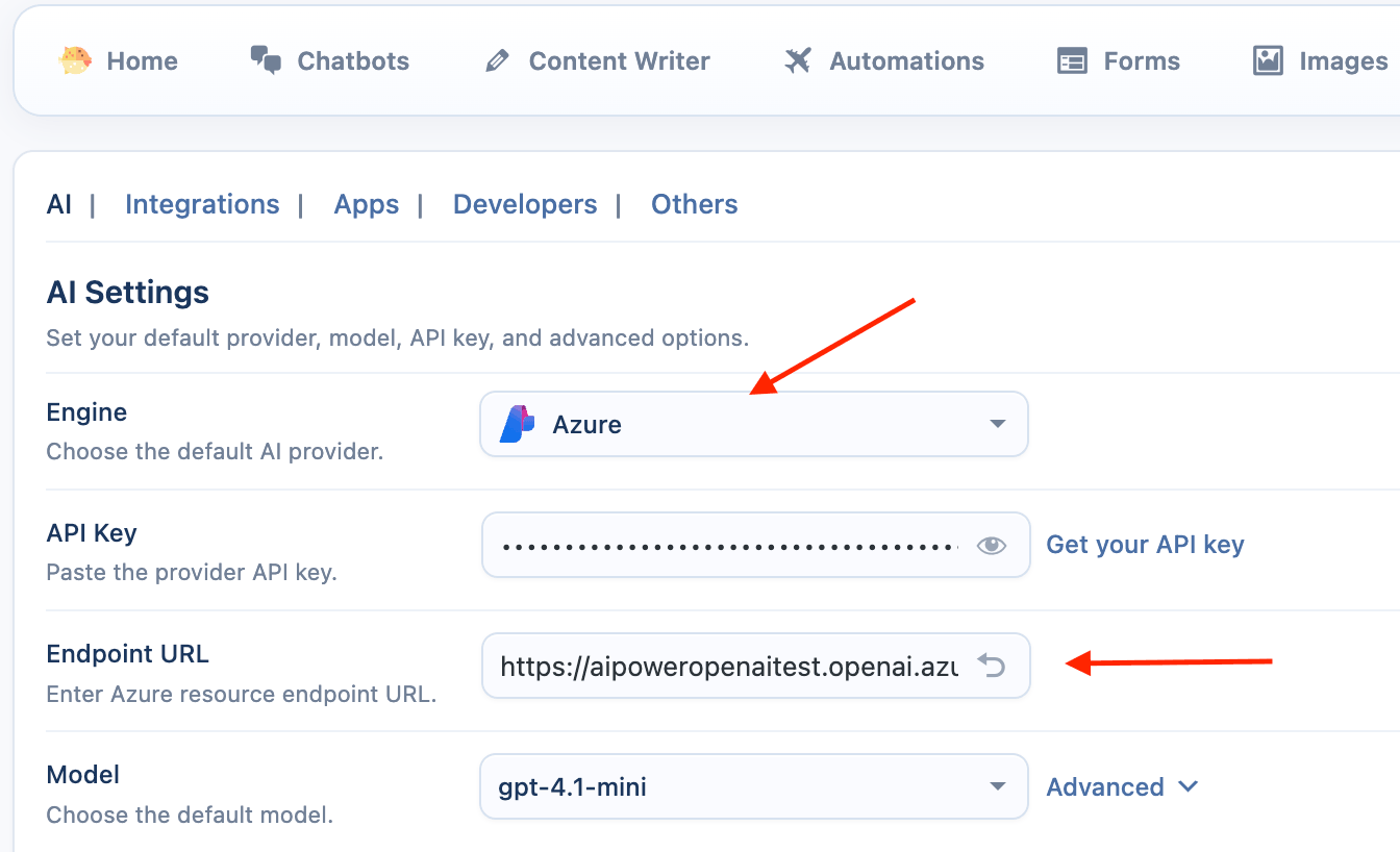 - Select the Provider: From the Engine dropdown menu, choose Azure.
