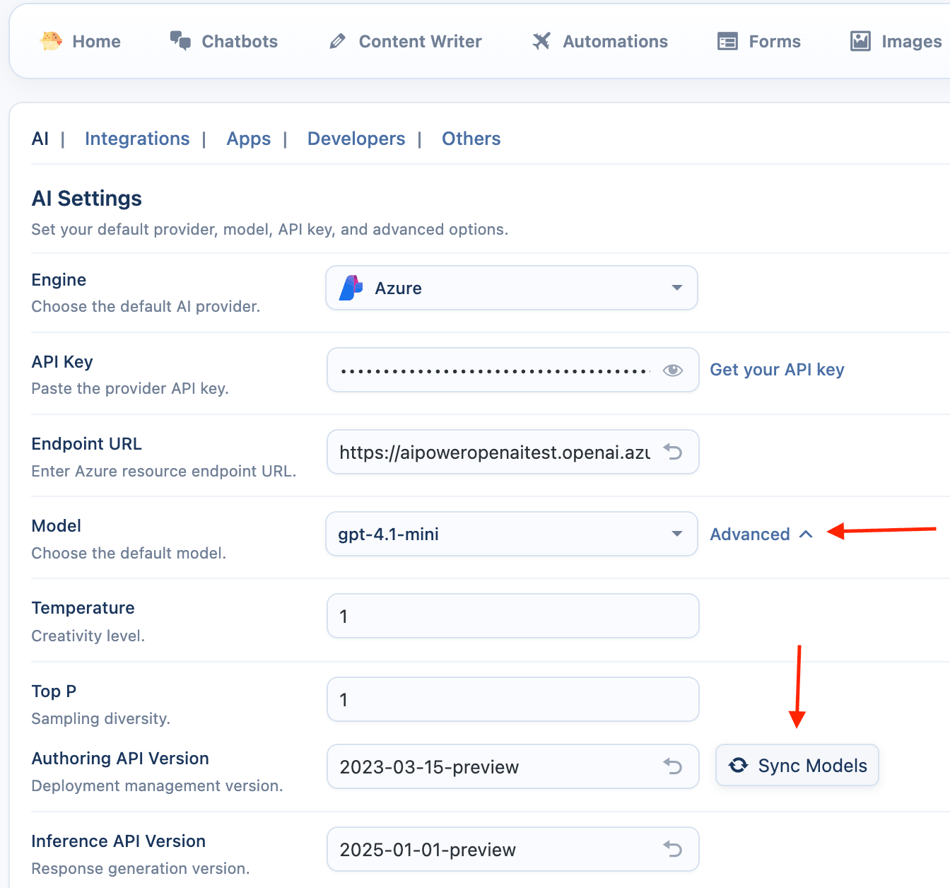 - Sync Deployments: For Azure, the "Sync" button fetches your Deployments, not the base models. You must first deploy a model (e.g., gpt-4o) in Azure to have it appear in the list.