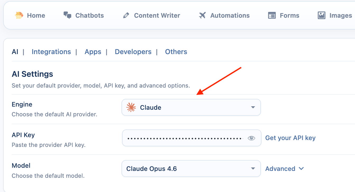 - Select the Provider: From the Engine dropdown menu, choose Claude.