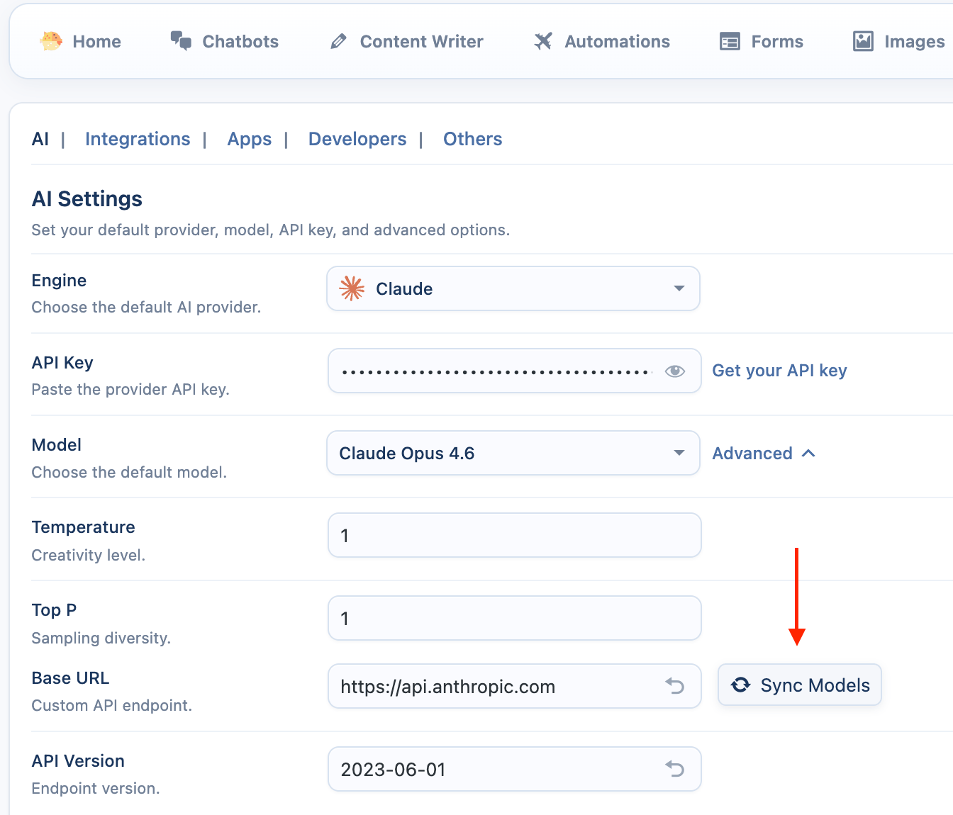 - Sync Models: Click Sync button to fetch the available Claude models from your Anthropic account.