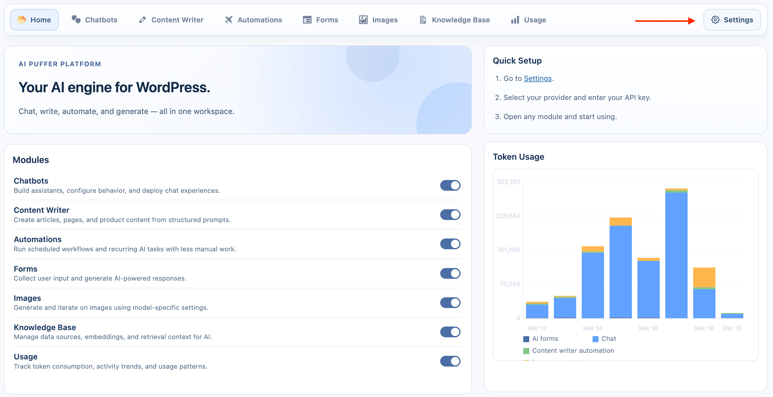 AI Puffer > Settings is the central area for managing your connections to different AI services and setting the default behavior for all of AI Puffer's modules.
