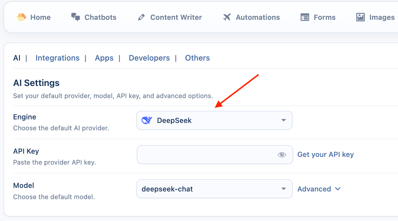 - Select the Provider: Go to the Engine dropdown menu and choose DeepSeek.