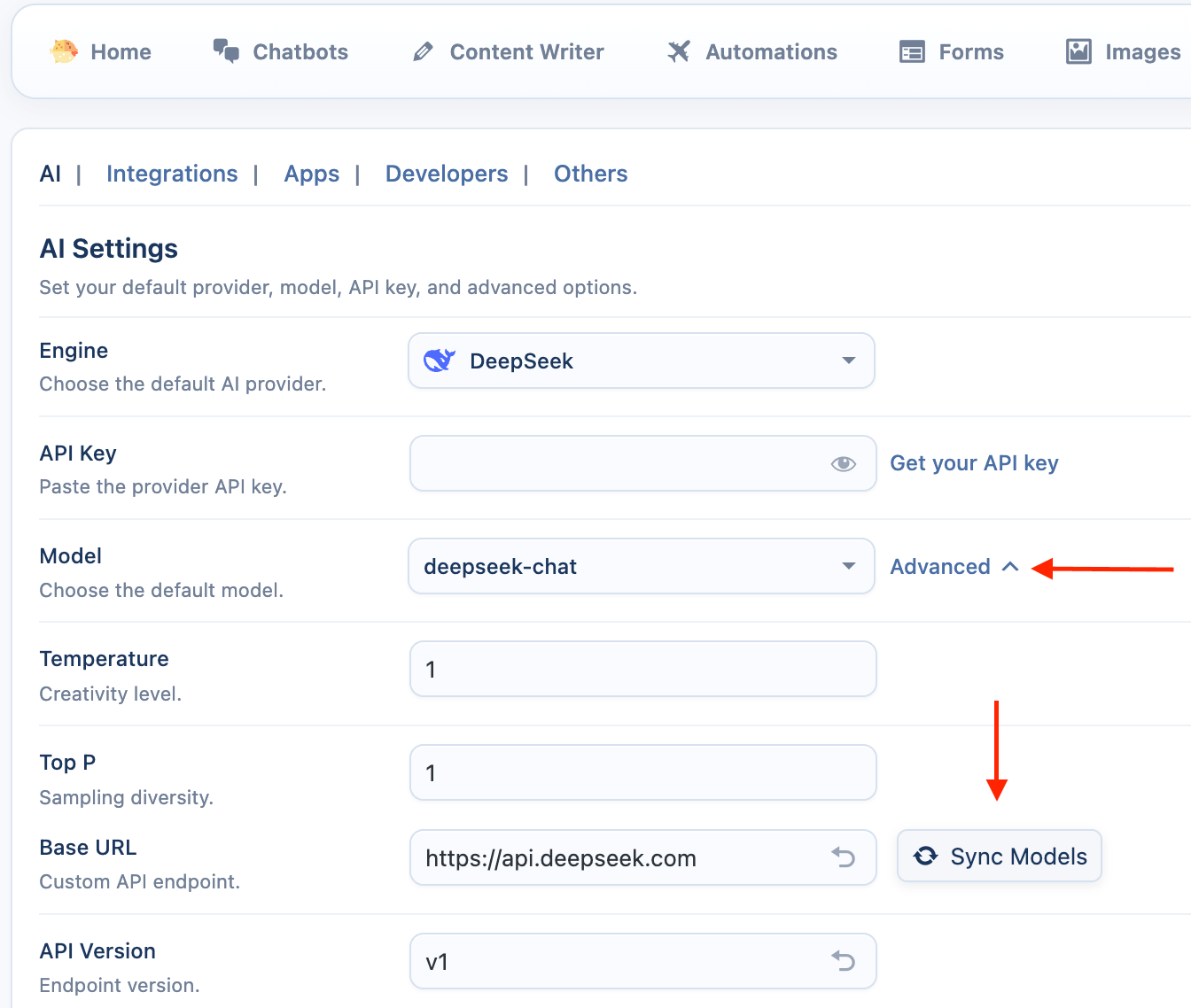 - Enter API Key: Enter your API key from the DeepSeek platform.