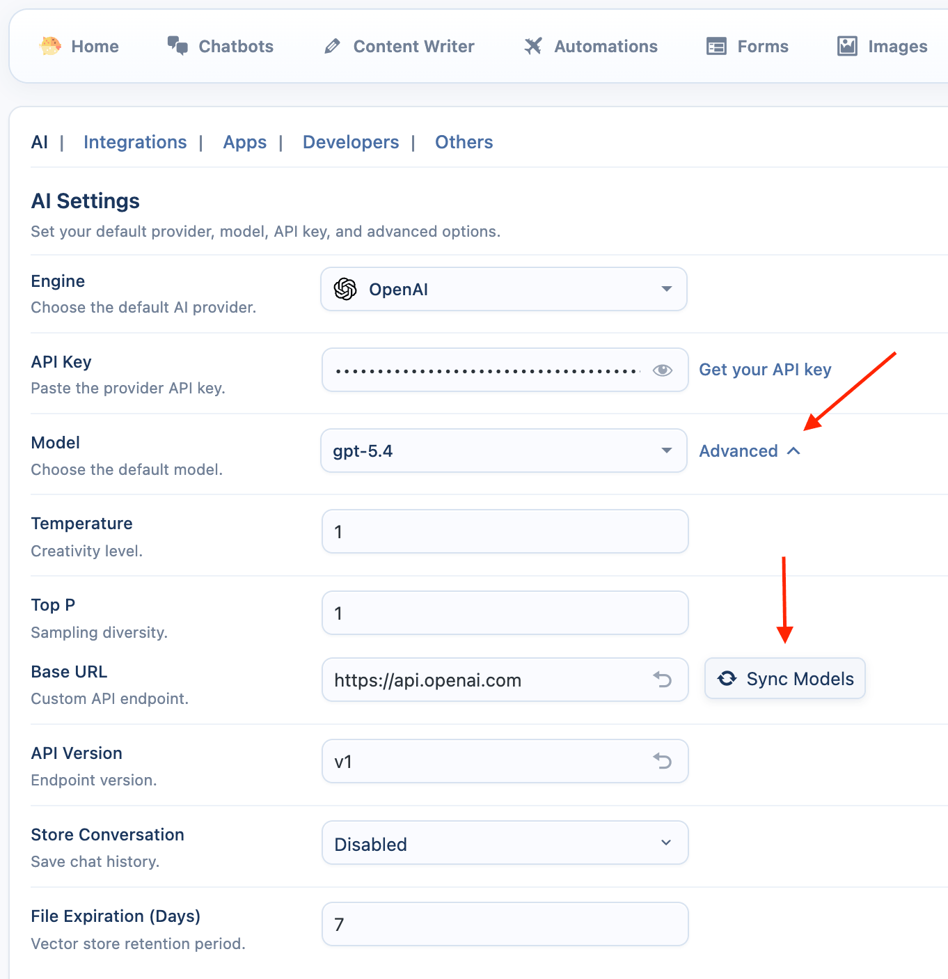 These settings are found in the Advanced tab when OpenAI is the selected provider.
