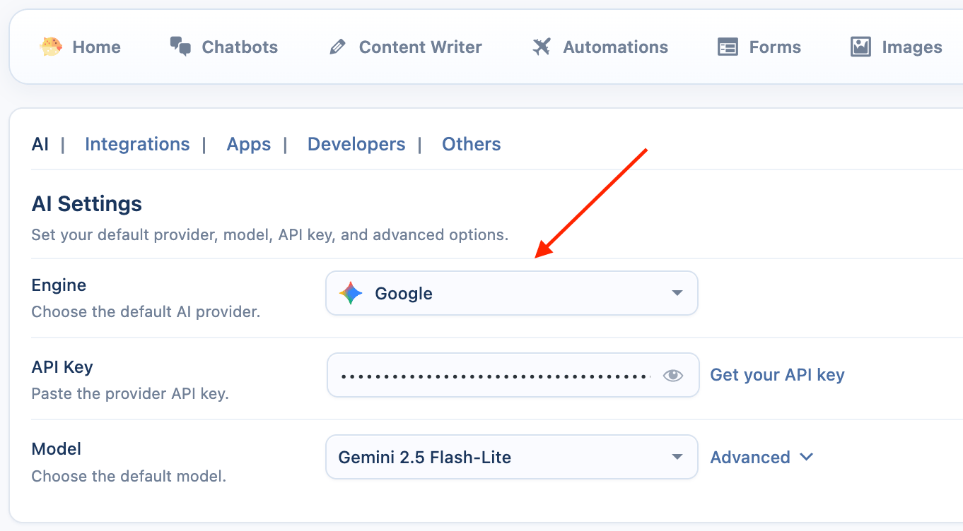 - Select the Provider: From the Engine dropdown menu, choose Google.