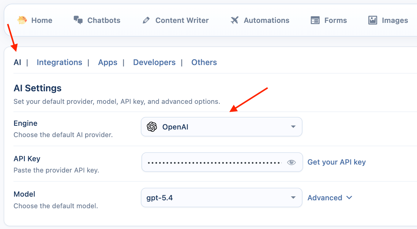 - Select the Provider: From the Engine dropdown menu, choose OpenAI. The provider selected here will also be the default for all modules.