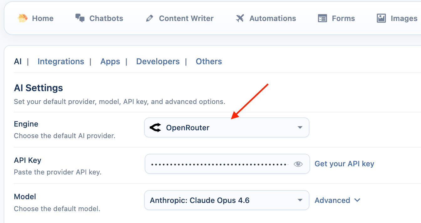 - Select the Provider: From the Engine dropdown menu, choose OpenRouter.