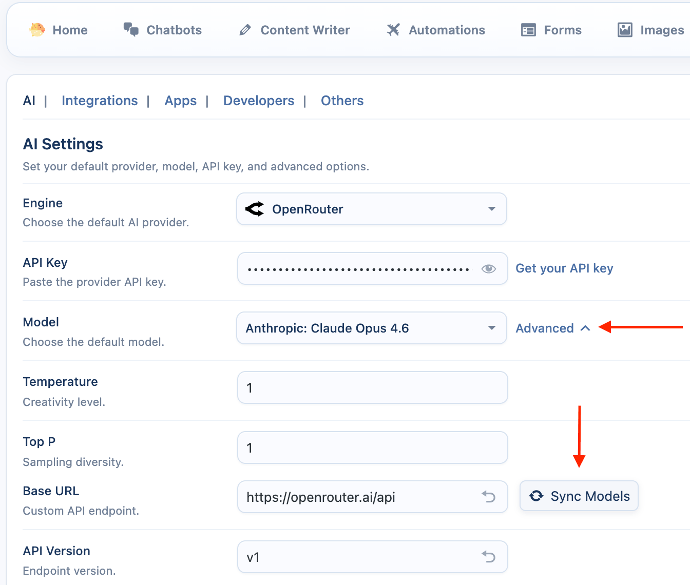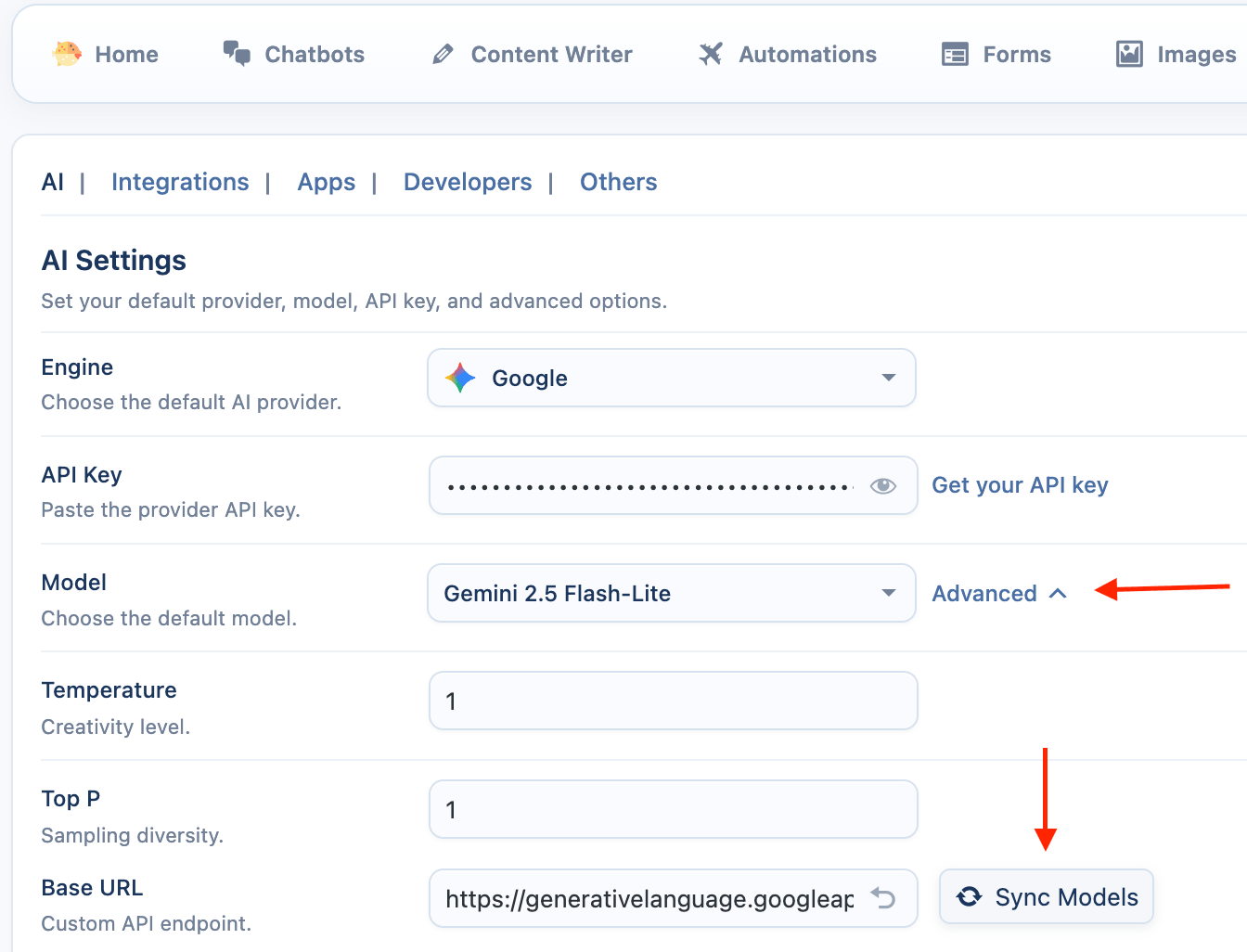 - Sync Models: Click Advanced and then Sync button to fetch available Gemini models.