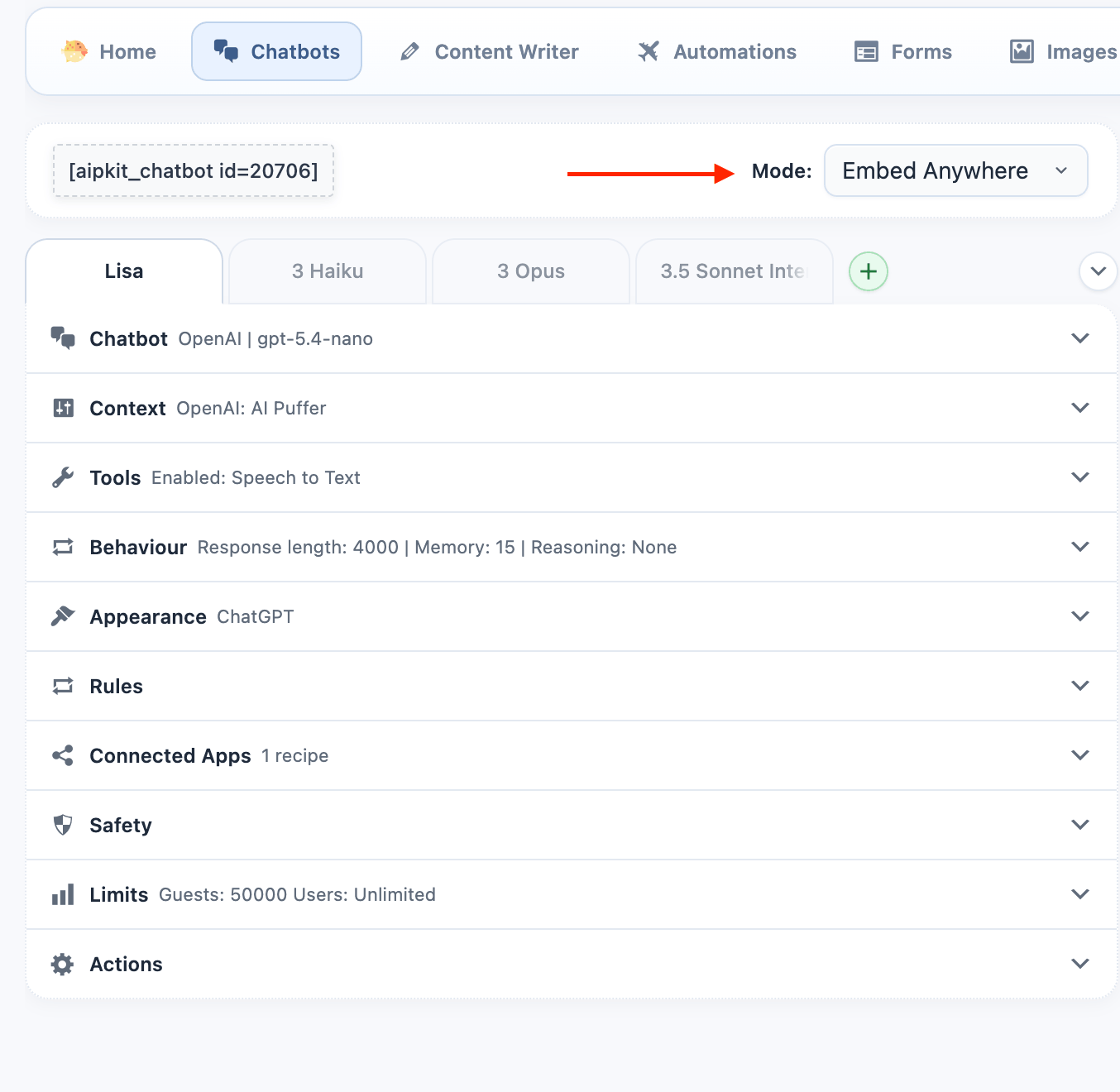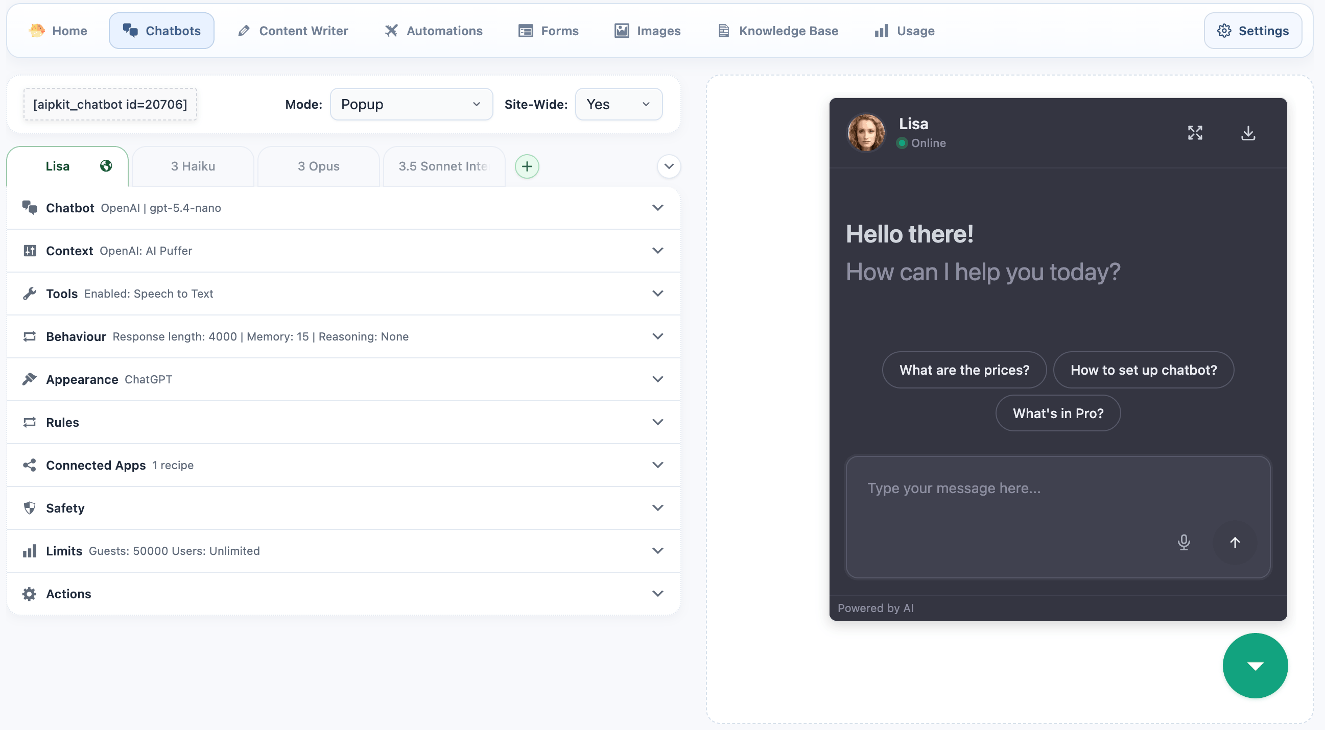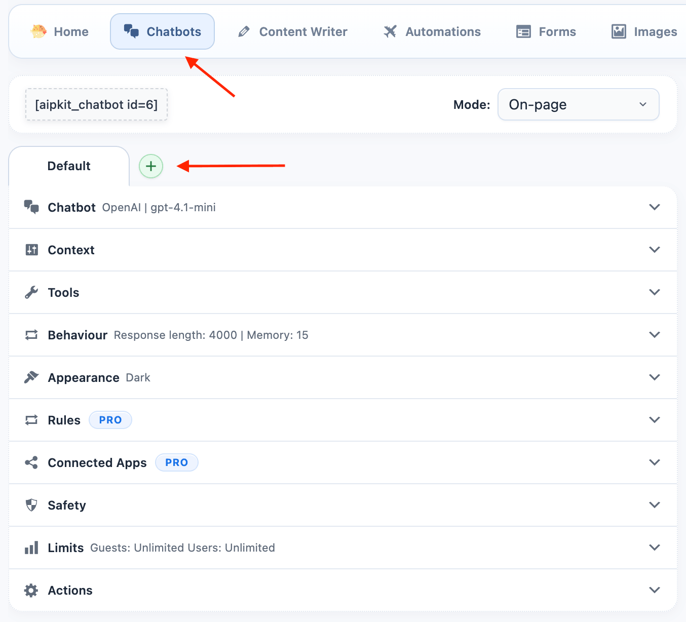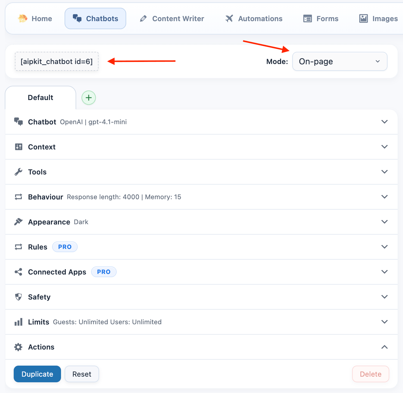 - On-page: Embed the chatbot directly inside a page, post, or widget with a shortcode.