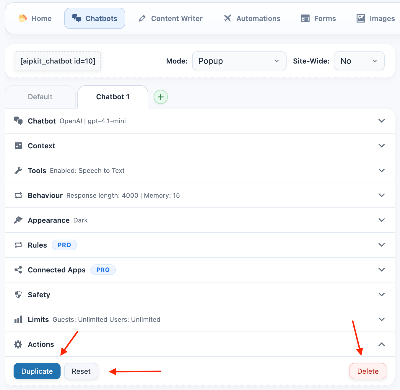 - Open the Actions accordion to Duplicate, Reset, or Delete the active bot.