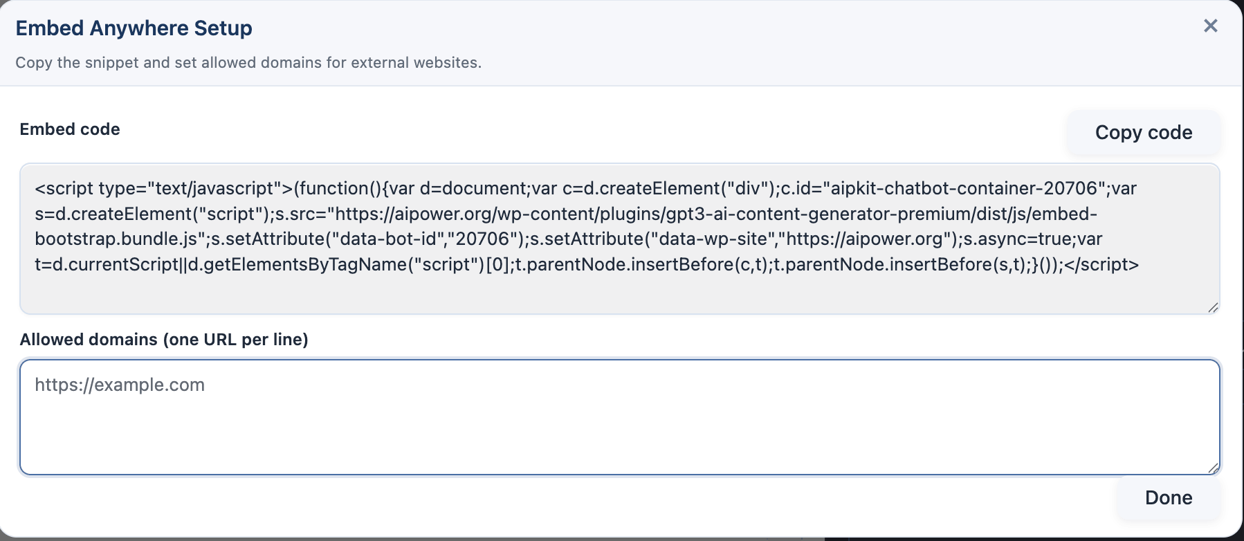 Select Embed Anywhere in the Mode dropdown to open the setup modal.