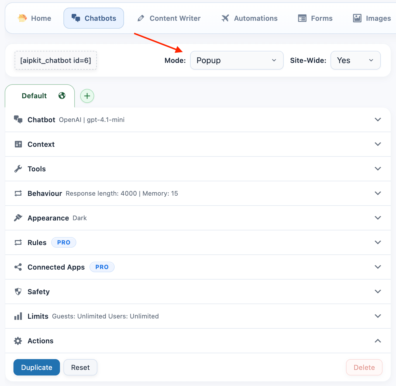 - Choose whether the popup should be Site-Wide or only used where the bot is embedded.