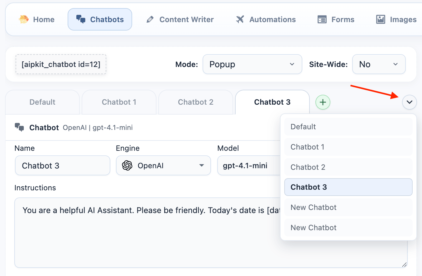 - Use the chatbot tabs at the top of the builder to switch between bots.