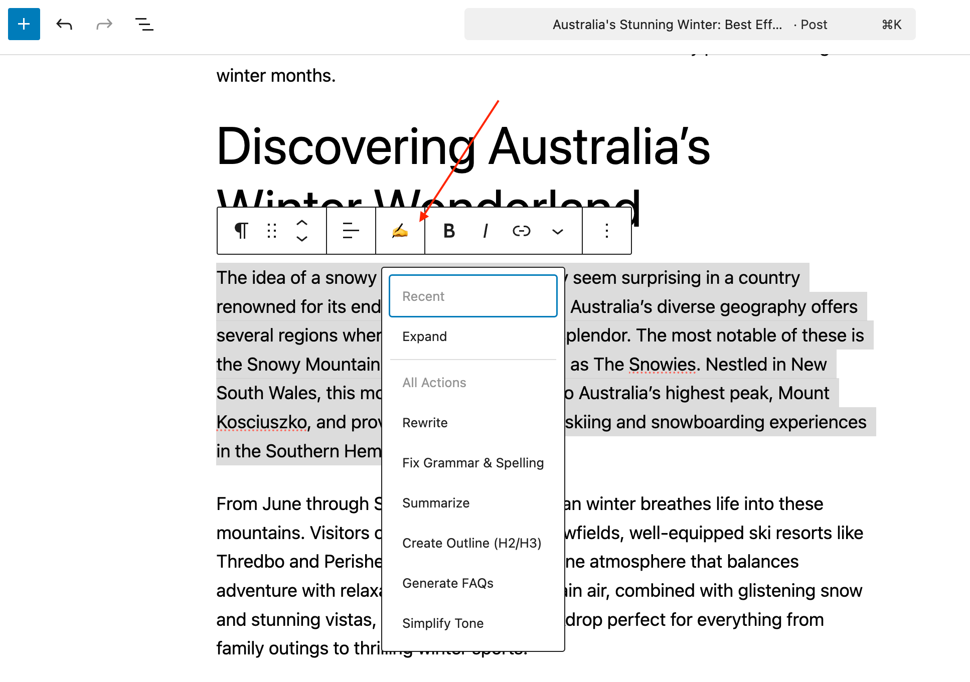 - Pick an action (e.g., Rewrite, Expand, Fix Grammar, Summarize, Create Outline, Generate FAQs, Simplify Tone).