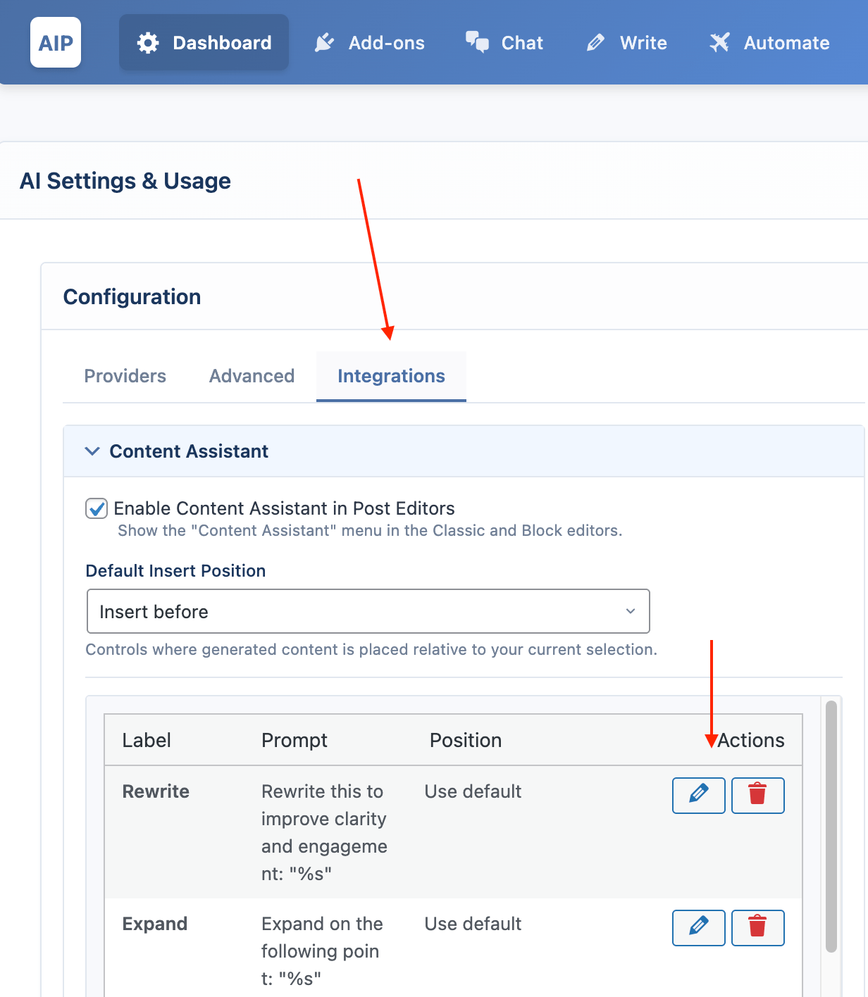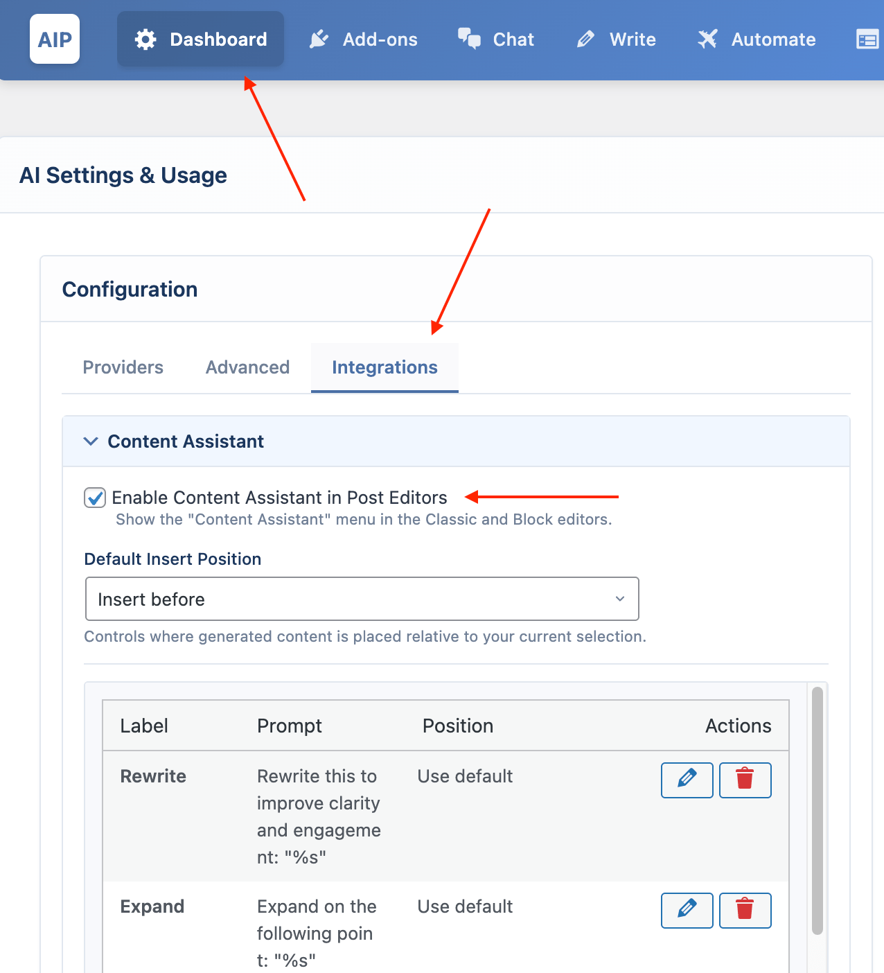 - Go to AIP > Dashboard > Integrations > Content Assistant.