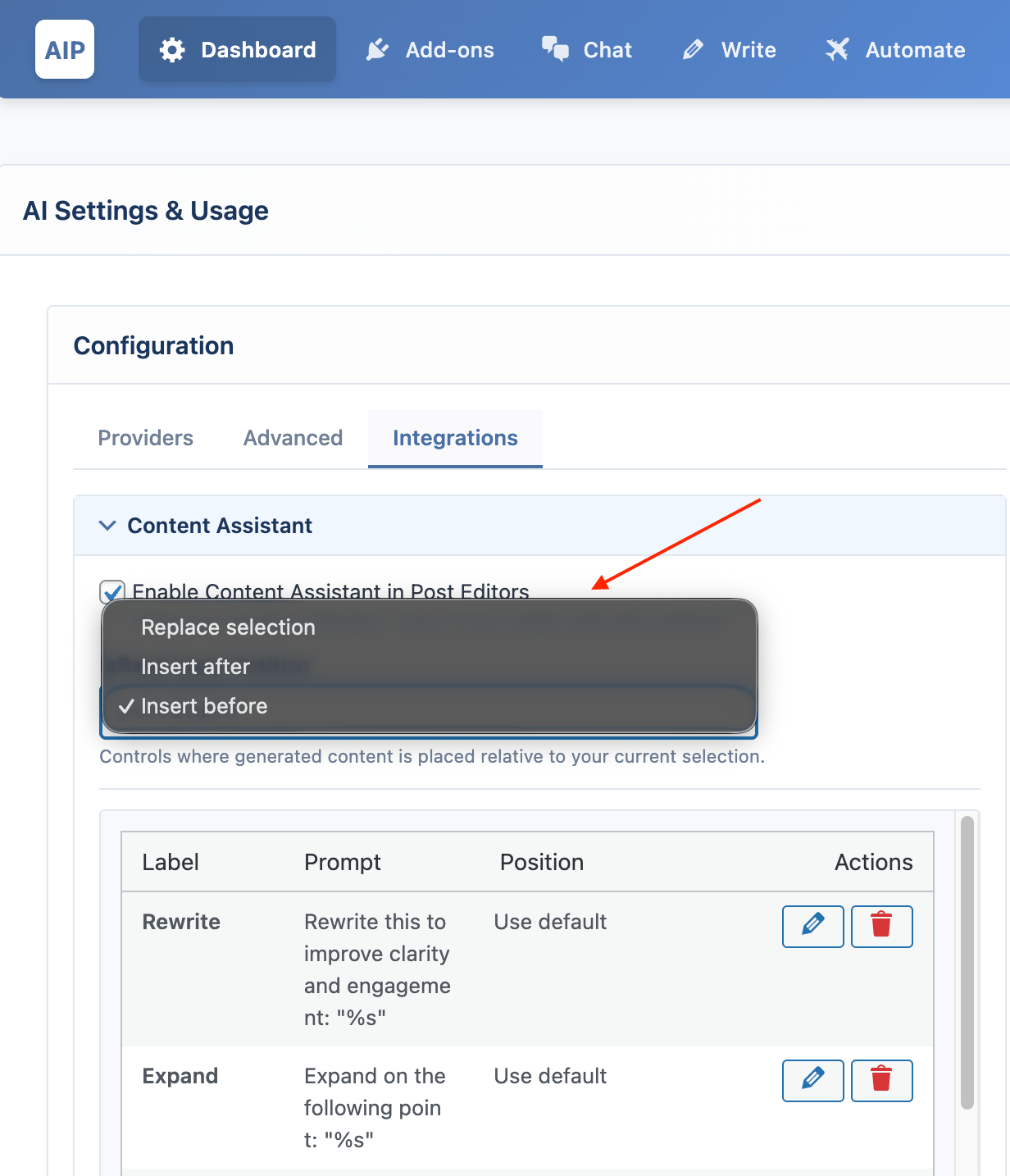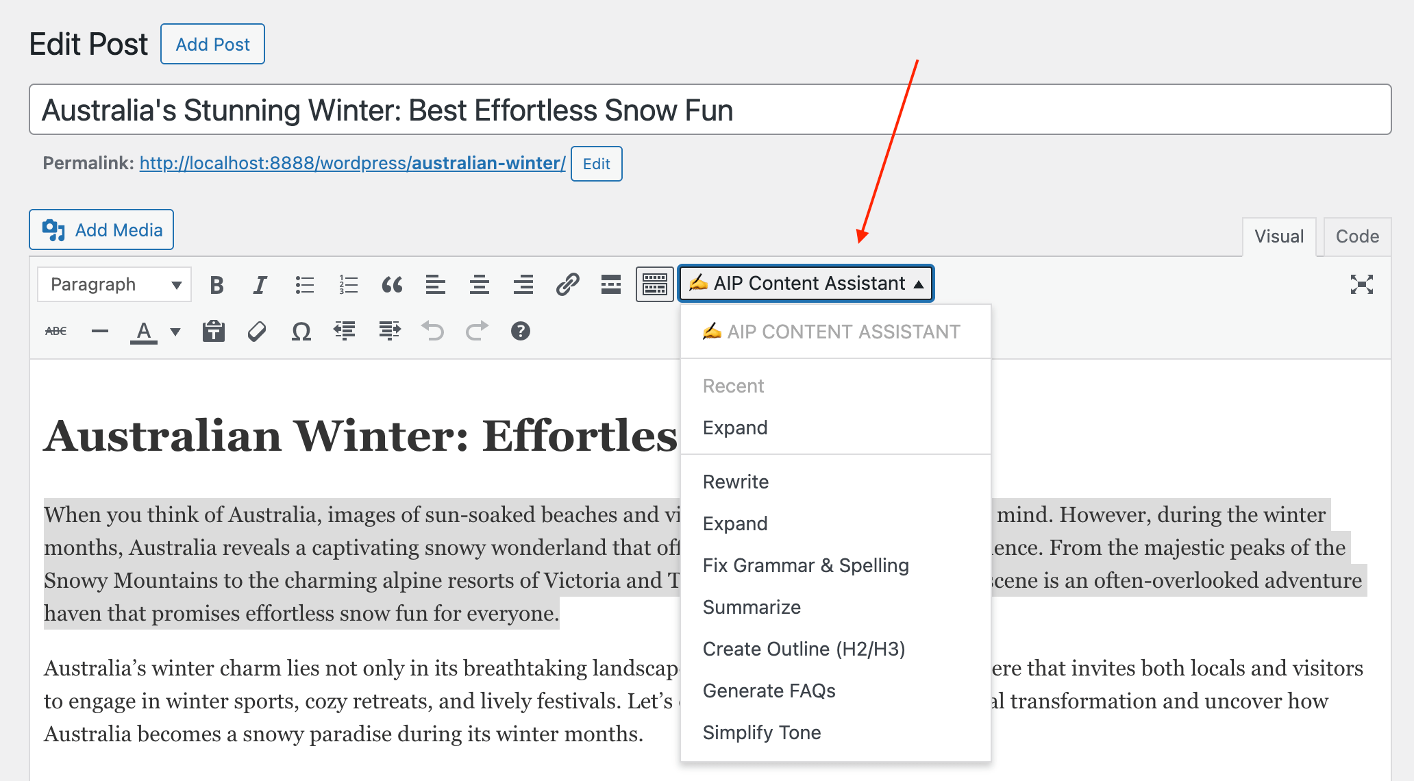 - Click the ✍️ AIP Content Assistant dropdown in the TinyMCE toolbar.