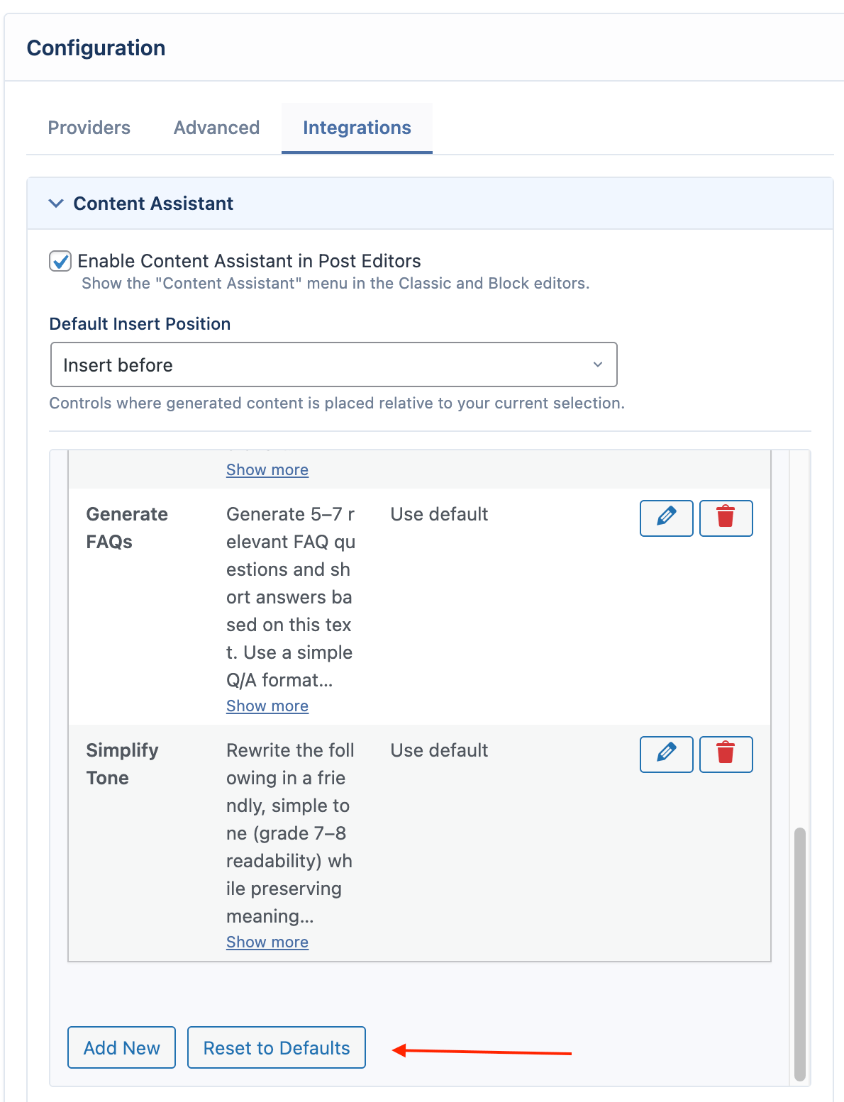 The Content Assistant provides a suite of tools to improve existing content directly within your WordPress admin area. You can bulk update posts, generate new titles and excerpts from the posts list, and process text directly within the post editor.